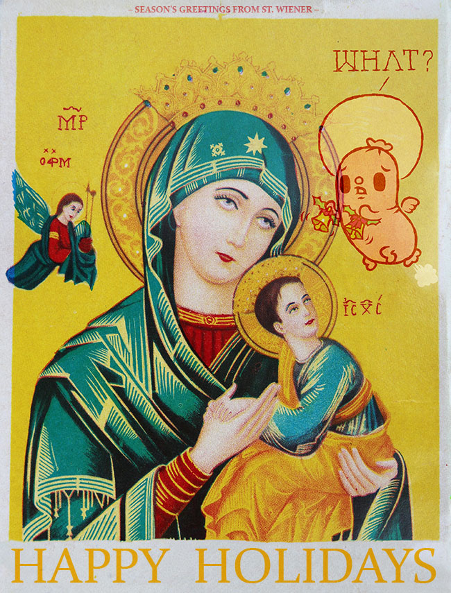 …above image is one of few weird & vintage mini-posters i scored in Singapore’s little india area, i believe this is an indian version of christian art?! thought it’d be fun to have my St. Wiener in this picture, so i spent my night of december 21 doodling this picture and waiting for something to happen….not! anyways, that goes my season’s greeting card to you! feel free to download and/or share it with your friends/family! enjoy!