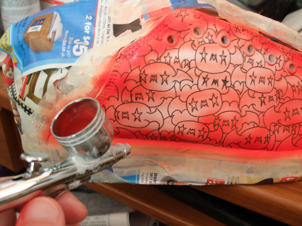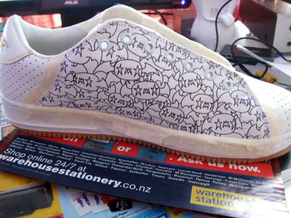 This is my first custom kicks, a Hollow Threat bats all over design that interacts with the supporting painting(you’ll see at the show, or later on my portfolio), i’ve been digging the nu-pattern-art lately, especially those with character involved, so i thought my Hollow Threat bats(death bats? skull bats?) would look cool as a repetitive pattern on sneakers, the idea came from the bat flying transition scene in my toy videos! (i wish i could just copy/paste like i did in the animation).