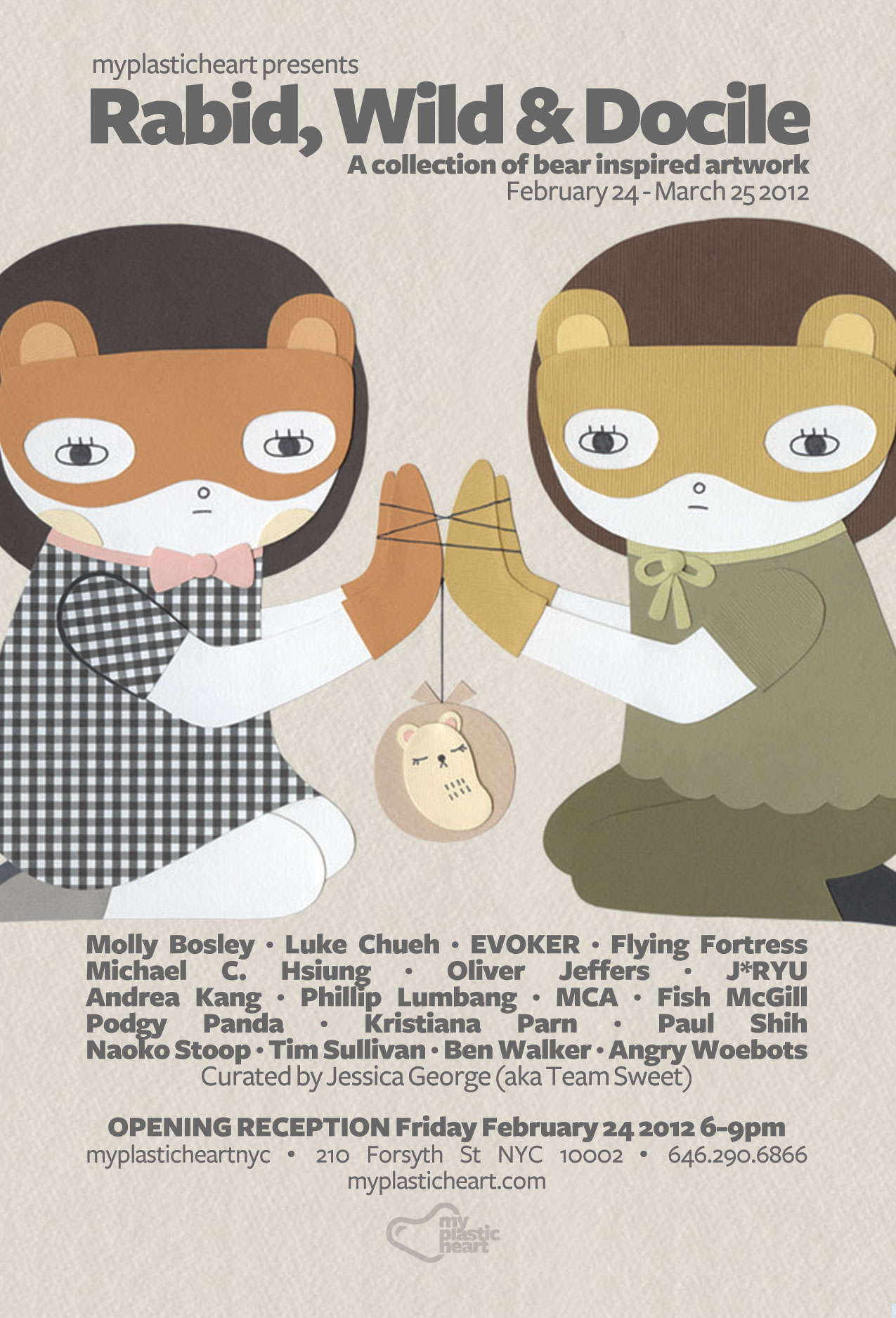 myplasticheart presents Rabid, Wild & Docile: A collection of bear inspired artwork. curated by Jessica George, look what she put together this time, such a diverse lineup plus some nice surprises, and i’m stoked to be part of this! its a strictly all bear show, my PANDARA granted a pass to the show, and he is bringing a bear buddy along! you can expect a new PANDARA colorway at the show, a special colorway for 3rd anniversary edition releasing later this year, be the first to see it(and take him home)! i also did a canvas painting for the show, introducing two new characters in this piece, they might soon be in the HOLLOW THREAT toy collection! ;-)