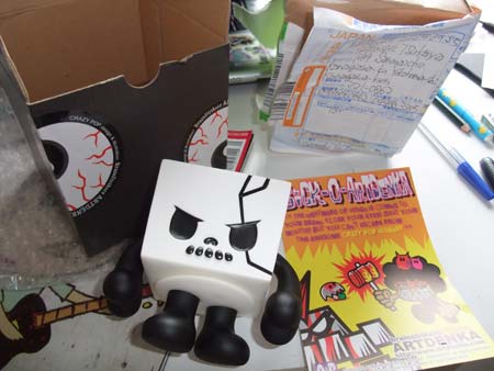 Artdenka‘s skullbox arrived this morning, when mr post man knock on my door, i have a bad feeling about the package, and yes its the familiar evil toy from hell! i did a custom for it last year(can be seen in portfolio), and now アートデンカ planing on a new skullbox custom show in the next tokyo design festa! more updates on the show & my new custom to follow soon… :-)